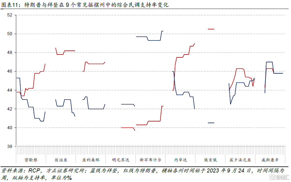 如果将一些常见的摇摆州也纳入(图表11),我们可发现当前特朗普在佐治亚州(领先7%)、俄亥俄州(领先10%)、内华达州(7%)已有较稳定的优势,而在新罕布什尔州(落后8%)的劣势则较为明显。
