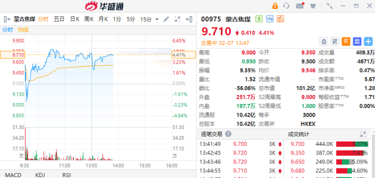 2月7日,蒙古焦煤(00975)盘中一度再涨超5%创新高,截至发稿,涨4.41%,报9.71港元,成交额4671万港元。