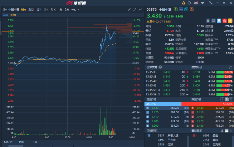 中国中药(00570)午后直线拉升,股价上涨9.30%,现报3.43港元。