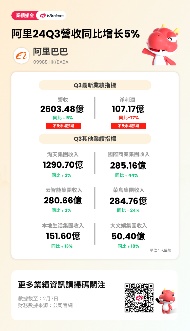 来自菜鸟集团(CSNLL)的营收为284.76亿元(约合40.11亿美元),同比增长24%。