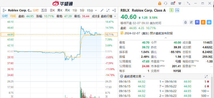 Roblox $RBLX 周三公布了超预期的2023财年第四季度业绩,并提供了强劲的业绩指引。财报公布后,该股盘前上涨10.171%。
