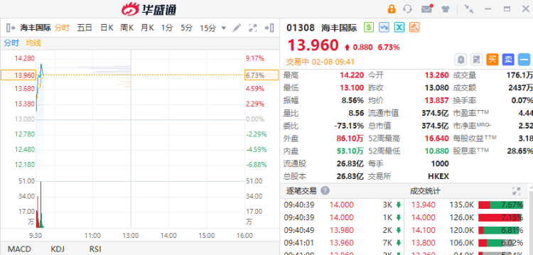 2月8日,海丰国际(01308)早盘走强,截至发稿,涨6.73%,报13.96港元,成交额2437万港元。