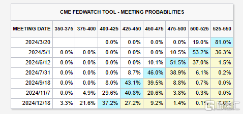 据CME“美联储观察”数据,美联储3月维持利率在5.25%-5.50%区间不变的概率为81%,降息25个基点的概率为19%。到5月维持利率不变的概率为36.3%,累计降息25个基点的概率为53.2%,累计降息50个基点的概率为10.5%。
