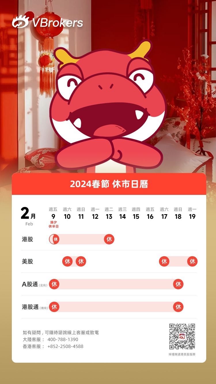 华盛资讯2月8日消息,春节假日即将临近,据港交所交易安排,港股于2月9日(星期五)上午开市,下午休市,2月10日(星期六)至2月13日(星期二)休市,2月14日(星期三)起照常开市,美股正常开市。具体如下: