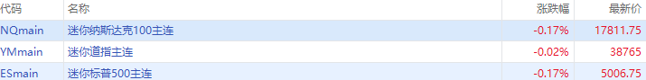 2月8日(周四)美股盘前,美股三大股指期货齐跌。截至发稿,纳指期货 $NQmain 跌0.17%,标普500指数期货 $ESmain 跌0.17%,道指期货 $YMmain 跌0.02%。
