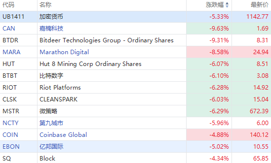 加密货币概念股普遍回调,嘉楠科技跌超10%,Marathon Digital跌超8%,Riot Platforms、微策略跌超6%,Coinbase Global跌超4%。消息面上, 比特币向下触及49000美元/枚,日内跌1.76%。