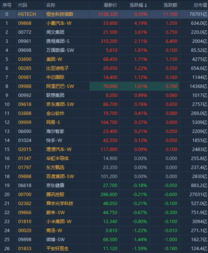 其他成分股方面,阅文集团涨近4%,携程集团-S涨超2%,比亚迪电子、中芯国际涨超1%。