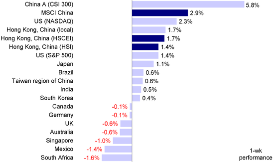 图表:中国市场、尤其是A股,上周跑赢全球多数其它市场