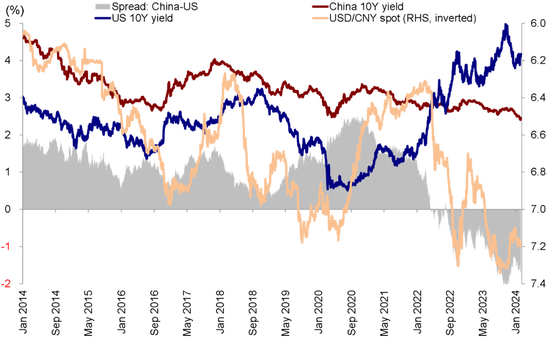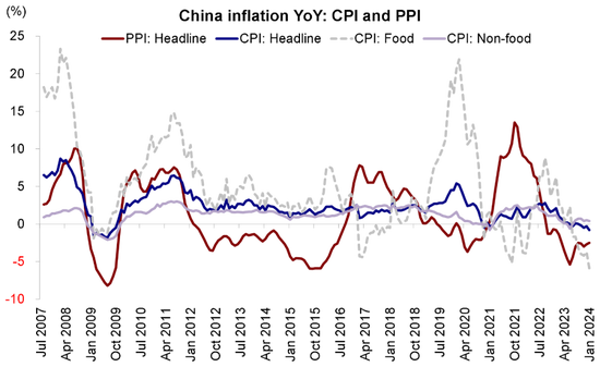 1) 通胀:2024年1月中国CPI创出2009年以来最大降幅,PPI过去16个月持续下降。1月中国CPI同比下滑0.8%,创出14年以来最大降幅,而且也是连续第四个月下滑。1月CPI同比显著下滑在一定程度上是受季节性因素影响,去年春节是在1月份,因此基数较高,尤其是食品价格方面,但另一方面也表明需求依然偏弱。与此同时,今年1月PPI同比下降2.5%(市场预期为下降2.6%),连续16个月为负。