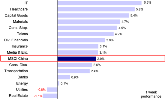 图表:MSCI中国指数上周上涨2.9%,其中医疗保健和信息技术板块领涨