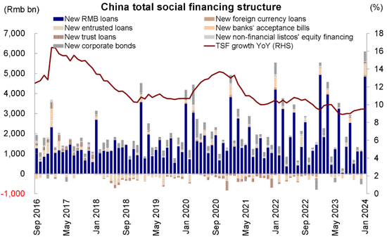 2) 2023年1月中国新增社融实现同比增长,新增贷款也大幅攀升,M1与M2剪刀差开始收窄。具体来看,1月新增社融达到6.5万亿元,高于市场预期,而且与2023年12月的1.94万亿元相比出现大幅增长。2024年1月新增人民币贷款达到4.92万亿元(2023年12月为1.17万亿元),也高于4.7万亿元的市场预期。我们注意到一个积极的迹象:随着M1同比增速从此前一个月的1.3%回升至5.9%而M2货币供应低于市场预期(同比增速从此前一个月的9.7%回落至8.7%),M1与M2增速剪刀差开始收窄。1月信贷和社融数据好于预期有春节错位和提前项目释放因素,但考虑到去年2月、3月新增贷款基数较高,今年2-3月贷款实现同比多增有一定难度。