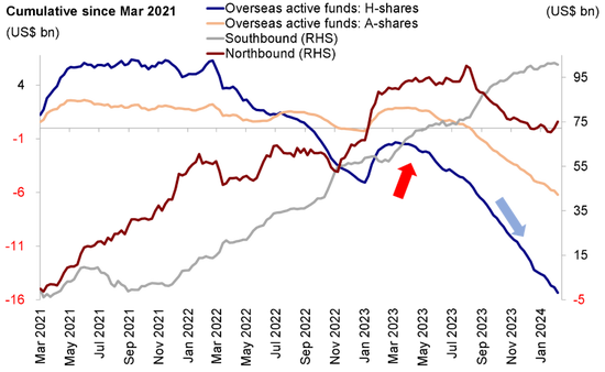虽然上述积极因素推动中国市场在春节假期前持续走高,但这一乐观情绪在港股市场中似乎略有降温,导致港股市场上周三后再度转弱。部分投资者对A股和港股的背离可能感到意外,但正如我们在最近几期周报中多次提出,在较低的估值水平和悲观的情绪下,只要一些积极催化剂出现就可以带来修复式的快速反弹。但这一反弹与持续的趋势逆转还有很大差距,若要做到这一点,则需要更为强力且有效的财政支持(《港股市场2024年展望:不疾而速》)。相应的,虽然我们看到北向资金再度出现超百亿的单日大举流入,但EPFR数据显示(我们认为是观察外资更为准确的窗口)海外主动型资金并未回流,甚至流出还有所扩大(《如何刻画并分析外资?》)。