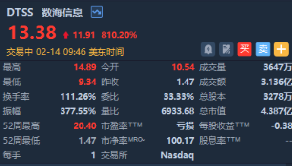 中概股多数走高,3倍做多A50 $YINN 涨近5%,数海信息暴涨825%,当前成交额超3亿美元,京东、蔚来涨超3%。