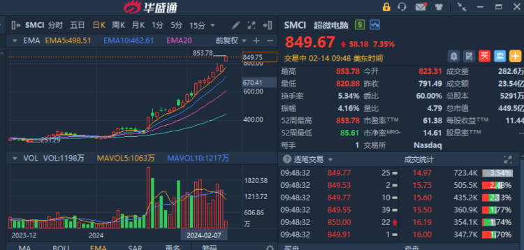 华盛资讯2月14日消息,美股三大指数早盘高开震荡,半导体板块强势领涨,截至发稿,超微电脑、 $ARM 均涨超7%;英伟达涨近2%,市值超越谷歌为美国市值第三高的公司。