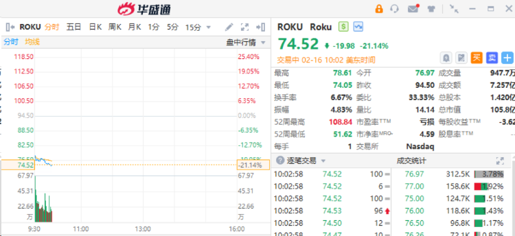 Roku绩后大跌21%,Q4每用户平均收入同比下降4%,引起市场担忧。