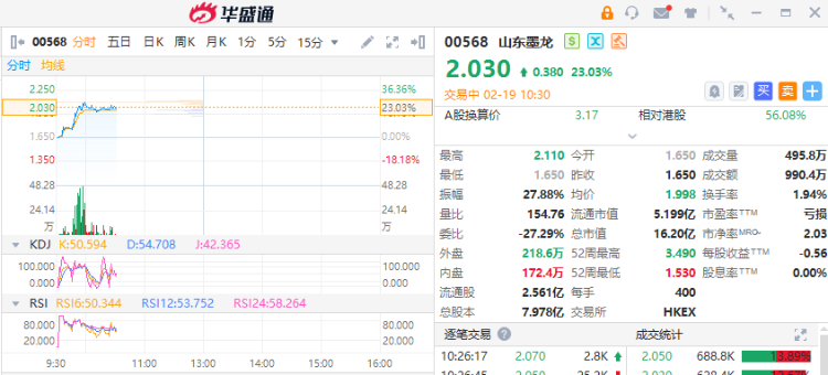 山东墨龙(00568)涨超23%,截止发稿涨23.03%,报2.03港元,成交额990万港元。