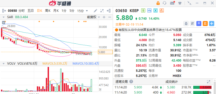 KEEP(03650)逆市走高涨超14%,截至发稿,涨14.4%,报5.88港元,成交额4734万港元。