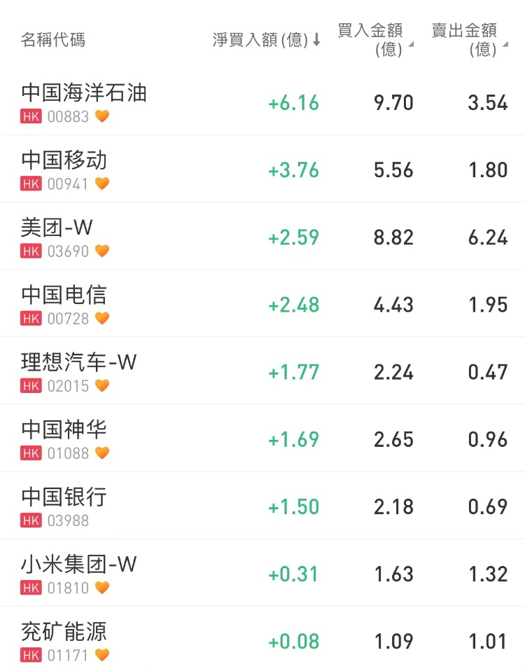 其中,南向资金净买入中国海洋石油6.16亿港元,中国移动3.76亿港元,中国电信2.48亿港元,美团2.59亿港元,中国神华1.69亿港元,理想汽车1.77亿港元,中国银行1.50亿港元;净卖出汇丰控股1.14亿港元。
