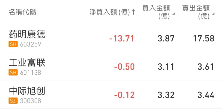北向资金净卖出63.72亿元,药明康德、工业富联、中际旭创分别遭净卖出13.71亿元、0.5亿元、0.12亿元;贵州茅台逆势获净买入9.4亿元。