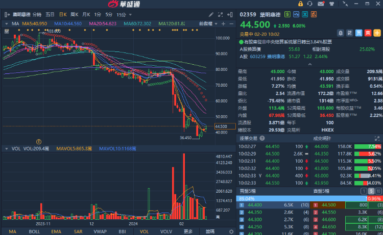 消息面上,根据香港联交所2月19日披露的文件,美国资本集团(The Capital Group Companies, Inc.)于2月15日以每股均价38.433港元增持药明康德97.55万股H股股份,价值约3,749.14万港元。