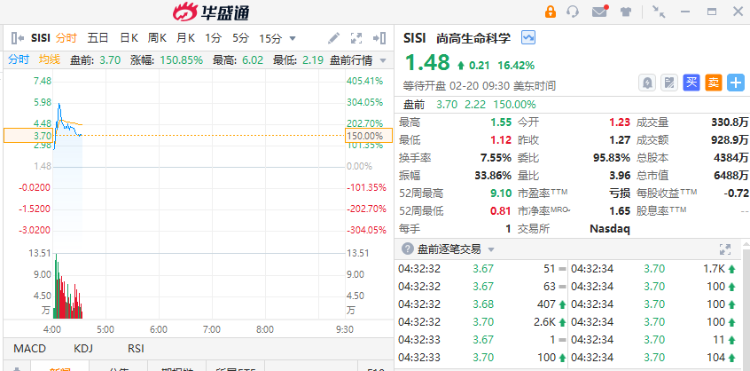 中概股尚高生命科学盘前一度暴涨300%,截至发稿升150%,盘前成交额逾260万美元,公司此前宣布反向拆分和战略股票合并。