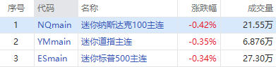 三大期指盘前走低,截至发稿,纳指期货 $NQmain 跌0.42%,标普500指数期货 $ESmain 跌0.34%,道指期货 $YMmain 跌0.35%。