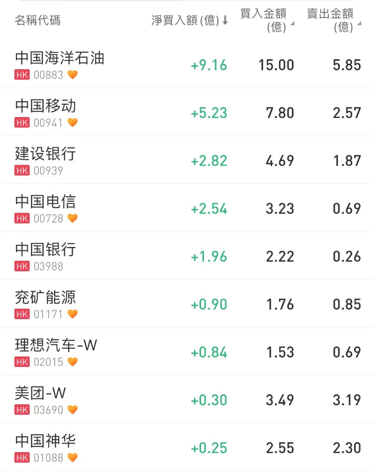 其中,南向资金净买入中海油9.16亿港元,中国移动5.23亿港元,建设银行2.82亿港元,中国电信2.54亿港元,中国银行1.96亿港元;净卖出腾讯控股2.05亿港元。