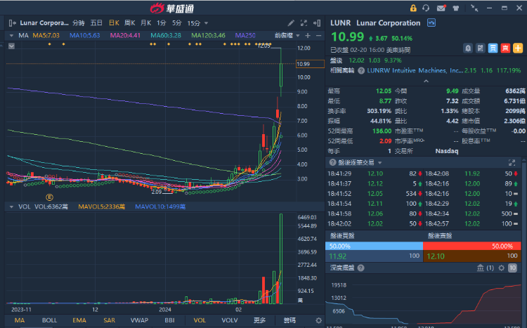 周二(2月20日),美国直觉机器公司(Intuitive Machines Inc)股价收升超50%报每股10.99美元,在连续三日暴涨后超过了其上市时10.03美元的价格,盘中最高一度达到每股12.05美元。
