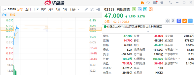 药明康德(02359)早盘再涨超5%,2月15日至今累计反弹近25%。截至发稿,涨3.87%,报47港元。