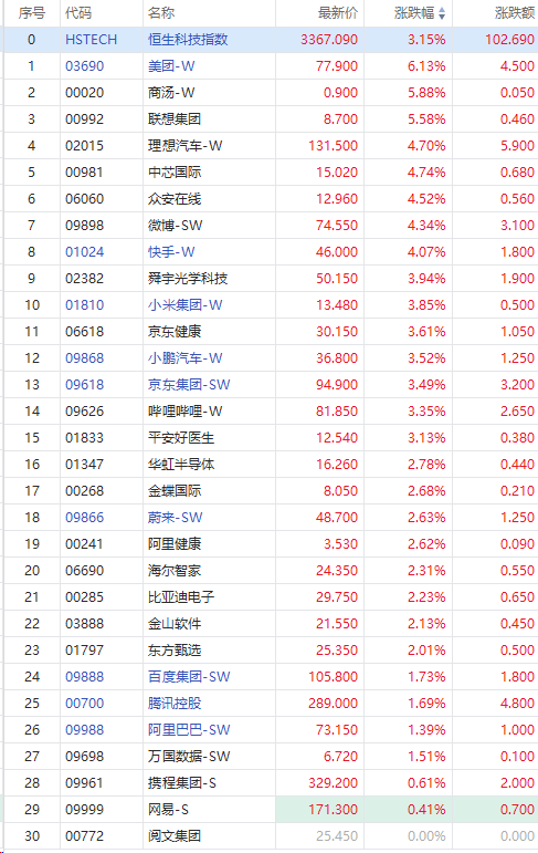 美团涨超6%,商汤、联想集团涨超5%,理想汽车、中芯国际、众安在线、快手涨超4%,小米、小鹏汽车、哔哩哔哩、平安好医生涨超3%,华虹半导体、金蝶国际、蔚来、阿里健康涨超2%,百度、腾讯、阿里涨超1%。