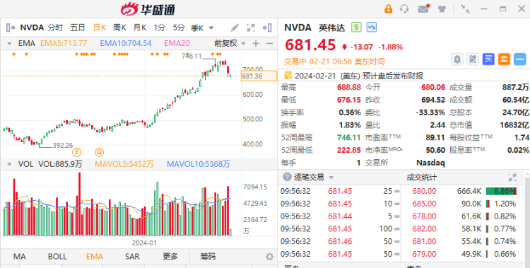 华盛资讯2月21日消息,美股三大指数盘初震荡走弱,半导体板块再度走弱。截至发稿,超微电脑跌超7%, $AMD 、$ARM 均跌超2%。英伟达现跌2.05%,将于今日盘后披露Q4业绩。