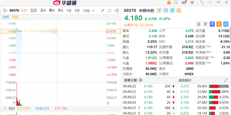 中国中药(00570)早盘拉升,截止发稿,涨21.87%,报4.18港元,成交额13.12亿港元。