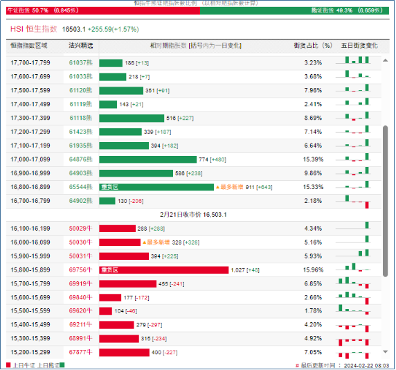 街货分布方面,至周三,恒指牛证街货重货区间主要在收回价15700点至16200点之间,累计相当约2492张期指合约;恒指熊证街货重货区主要在收回价16800点至17300点之间,累计相当约3004张期指合约。