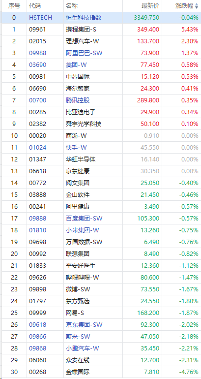 跌幅方面,金蝶国际跌超4%,众安在线、小鹏汽车、蔚来跌超2%,网易、东方甄选跌超1%,百度、小米小幅走弱。