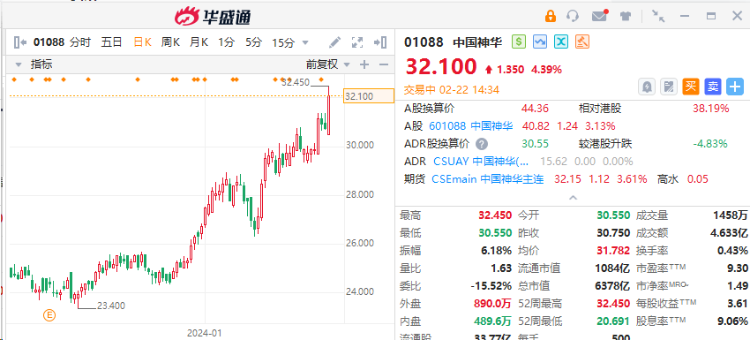 此外据披露,中国神华今年1月总发电量为224.6亿千瓦时,同比增长41.6%;总售电量212.3亿千瓦时,同比增长42.4%。中国神华表示,发电量、售电量同比增长的主要原因,是新机组投运导致发电量增加,以及上年同期受2023年春节假期影响基数较低。