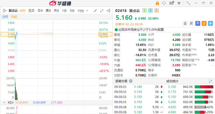 易点云(02416)早盘大幅上涨,截至发稿涨22.86%,报5.16港元,成交额5758万港元。