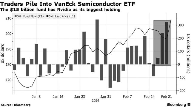 VanEck Semiconductor ETF大约四分之一的资金投资于英伟达,在三天内流入6.12亿美元后,该ETF的规模已增至超过150亿美元,有望创下自2022年10月以来最大单周资金流入。