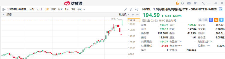 | 2倍做多英伟达( $NVDL ) | 194.59美元/股 | +117.18% | ||