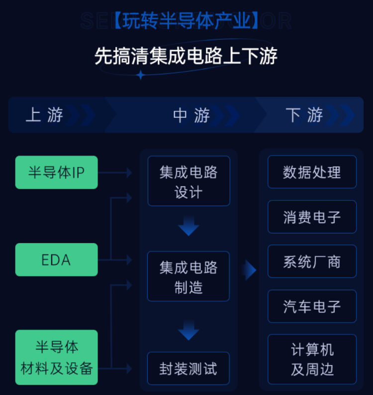 从集成电路全产业链来看,上游是半导体材料、设备及EDA 工具;中游是芯片设计、制造、封测三个关键环节(即是芯片从无到有的过程);下游应用领域包括消费电子、通讯、工业、数据中心、汽车电子等。