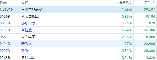 部分香港本地消费股向好,利宝阁集团(01869)涨6.98%,莎莎国际(00178)涨6.25%,普拉达(01913)涨5.64%,太兴集团(06811)涨2.38%,新秀丽(01910)涨1.27%。