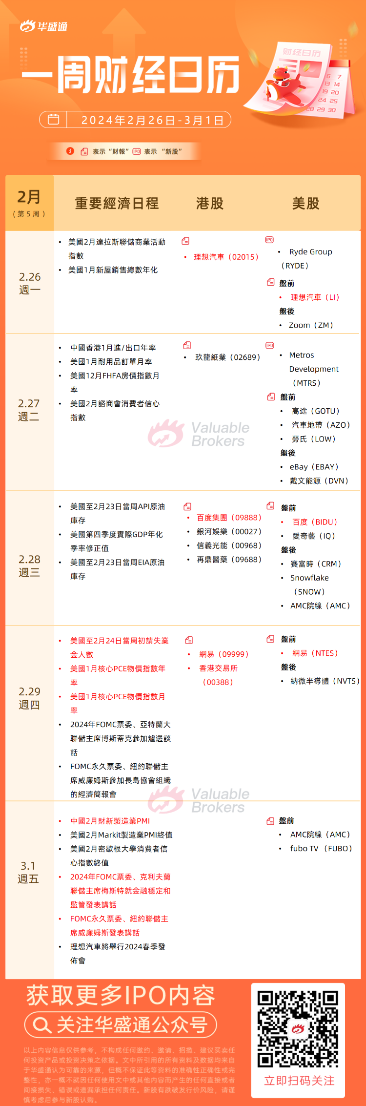 编者按:中概股财报周打响!理想、百度、网易等下周将公布业绩;博斯蒂克、威廉姆斯等官员将发表讲话;美国1月核心PCE数据将公布>>