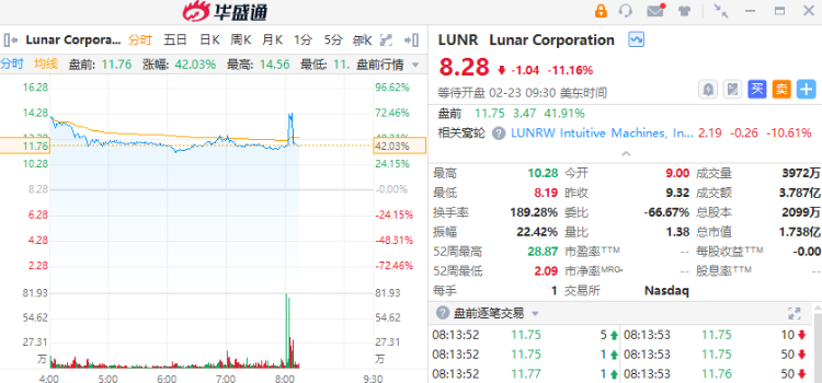 5、直觉机器盘前一度飙升近70%,旗下月球着陆器成功登月
