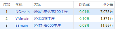 三大期指盘前小幅走高,截至发稿,纳指期货 $NQmain 涨0.01%,标普500指数期货 $ESmain 涨0.08%,道指期货 $YMmain 涨0.10%。