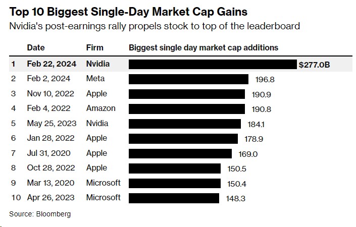 周五美股盘前,英伟达股价上涨了2.7%,前一交易日大涨逾16%,市值猛增2770亿美元至1.96万亿美元,并创下美股史上单日最高市值增幅。英伟达股价自今年年初以来上涨了59%,这将巩固其作为全球市值第四大公司的地位。英伟达的市值仅次于微软、苹果和沙特阿美。