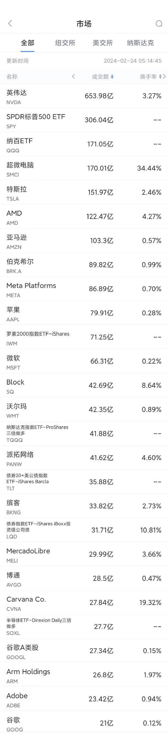 第2名超微电脑收跌11.84%,成交170.01亿美元。