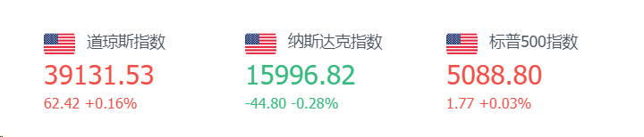上周五(2月23日),美股三大指数涨跌不一,道指、标普续创新高,周线上均录得上涨。截至收盘,道琼斯指数涨0.16%,报39,131.53点;标普500指数涨0.03%,报5,088.80点,收盘价双双刷新历史新高;纳斯达克综合指数跌0.28%,报15,996.82点,但盘中一度创下52周新高。