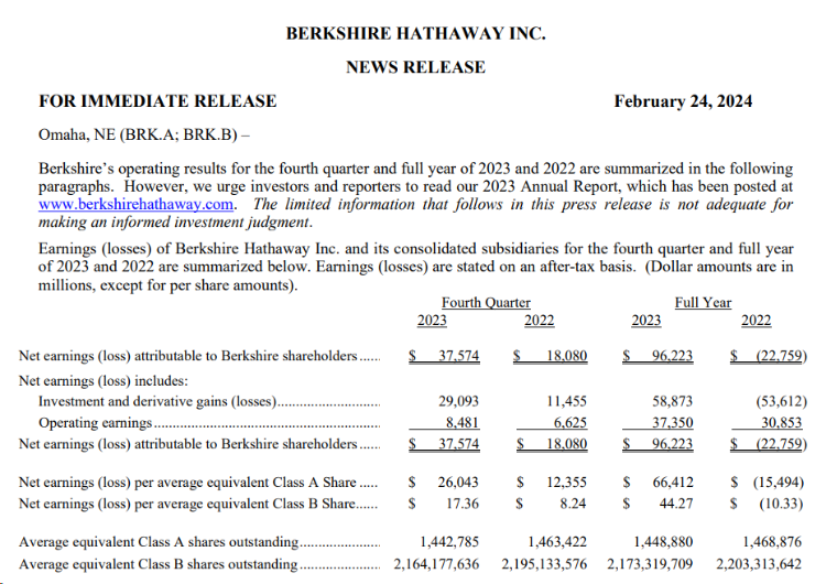 伯克希尔公布了2023年Q4及全年财报,其中:Q4净利润375.74亿美元,去年同期盈利180.8亿美元;2023年净盈利962.23亿美元,上年净亏损为227.59亿美元。此外,伯克希尔第四季度现金储备升至创纪录的1676亿美元。