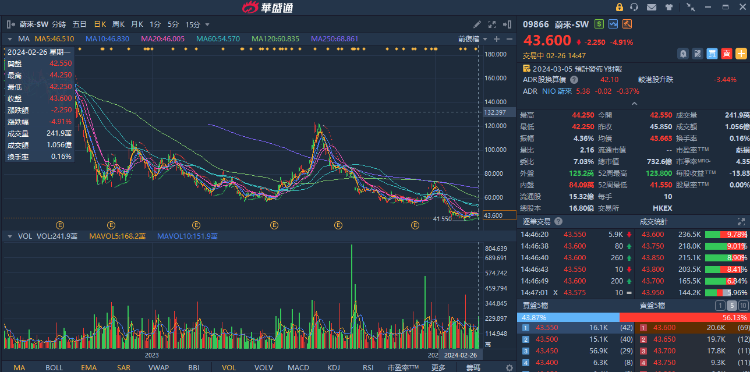 受机构下调评级及目标价影响,蔚来-SW(09866.HK)今日再度走弱,截至发稿跌4.91%,报43.60港元。