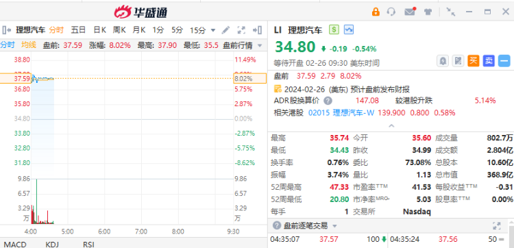 理想汽车盘前涨超8%,财报显示,理想2023年第四季度营收417.3亿元,上年同期176.5亿元,同比增加136.4%。理想汽车第四季度归属股东的调整后净利润44.9亿元人民币。季度交付量131,805辆,同比增长184.6%。全年实现营收1238.5亿元,同比增长173.5%;全年交付量376,030辆,同比增长182.2%。