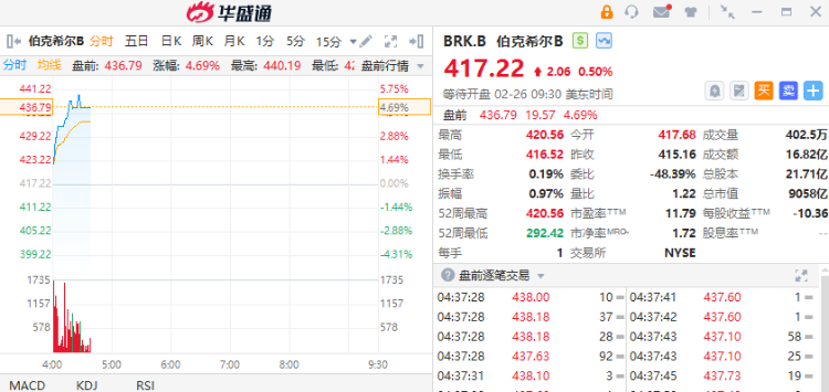 伯克希尔·哈撒韦B美股盘前涨近5%,财报显示,伯克希尔哈撒韦2023年营收3644.82亿美元,市场预期3140.8亿美元,上年同期3020.89亿美元;2023年净利润962.23亿美元,市场预期盈利408.21亿美元,上年同期净亏损228.19亿美元。其中,Q4营收84.8亿美元,环比下降21%,预期78.9亿美元;Q4净利润375.74亿美元,上年同期盈利180.80亿美元。